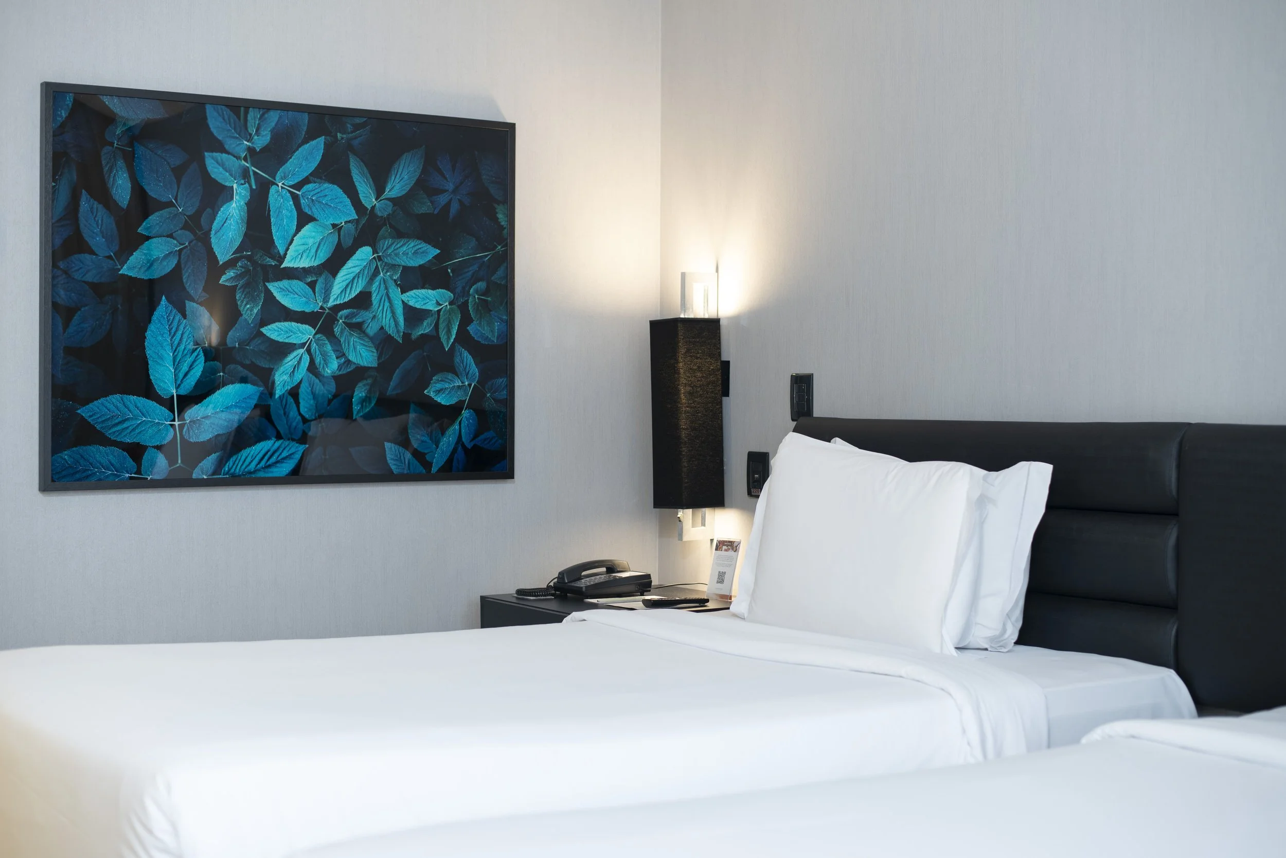 Desfrute de um quarto de 24 m² com duas camas de solteiro king, ar-condicionado, frigobar, cofre, TV 43", telefone e Wi-Fi grátis. O banheiro possui chuveiro, amenities by L'Occitane au Brésil e secador de cabelo. Quartos localizados do 3º ao 5º andar.
